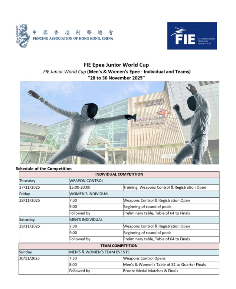 Сегодня в Гонконге дан старт одному из ключевых юношеских этапов Кубка мира по шпаге. На дорожки выходят 189 юношей и 147 девушек, представляющие более 29 стран. Среди участников — спортсмены из Японии, Венгрии, США, Сингапура, Польши, Филиппин, Малайзии, Республики Корея, Германии, Египта и других государств.